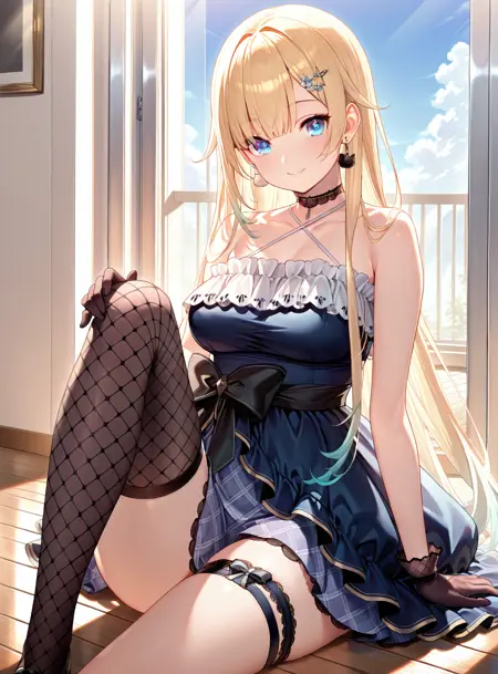 "choker, strapless layered dress, criss-cross halter, waist bow,"