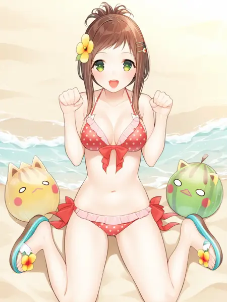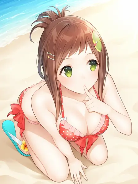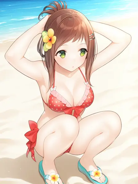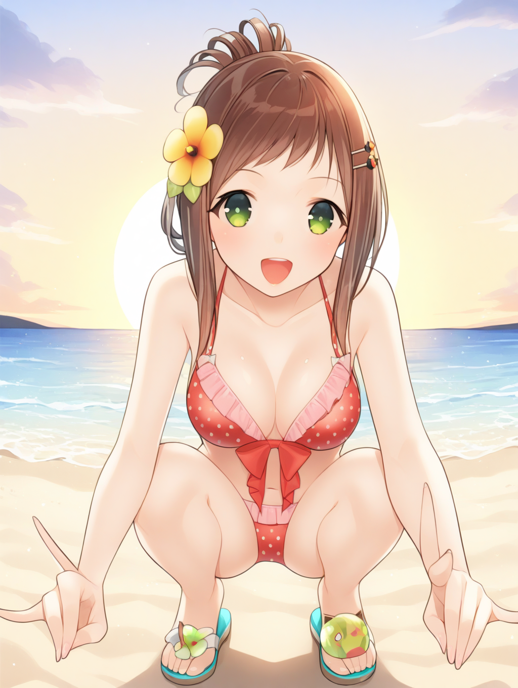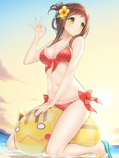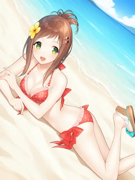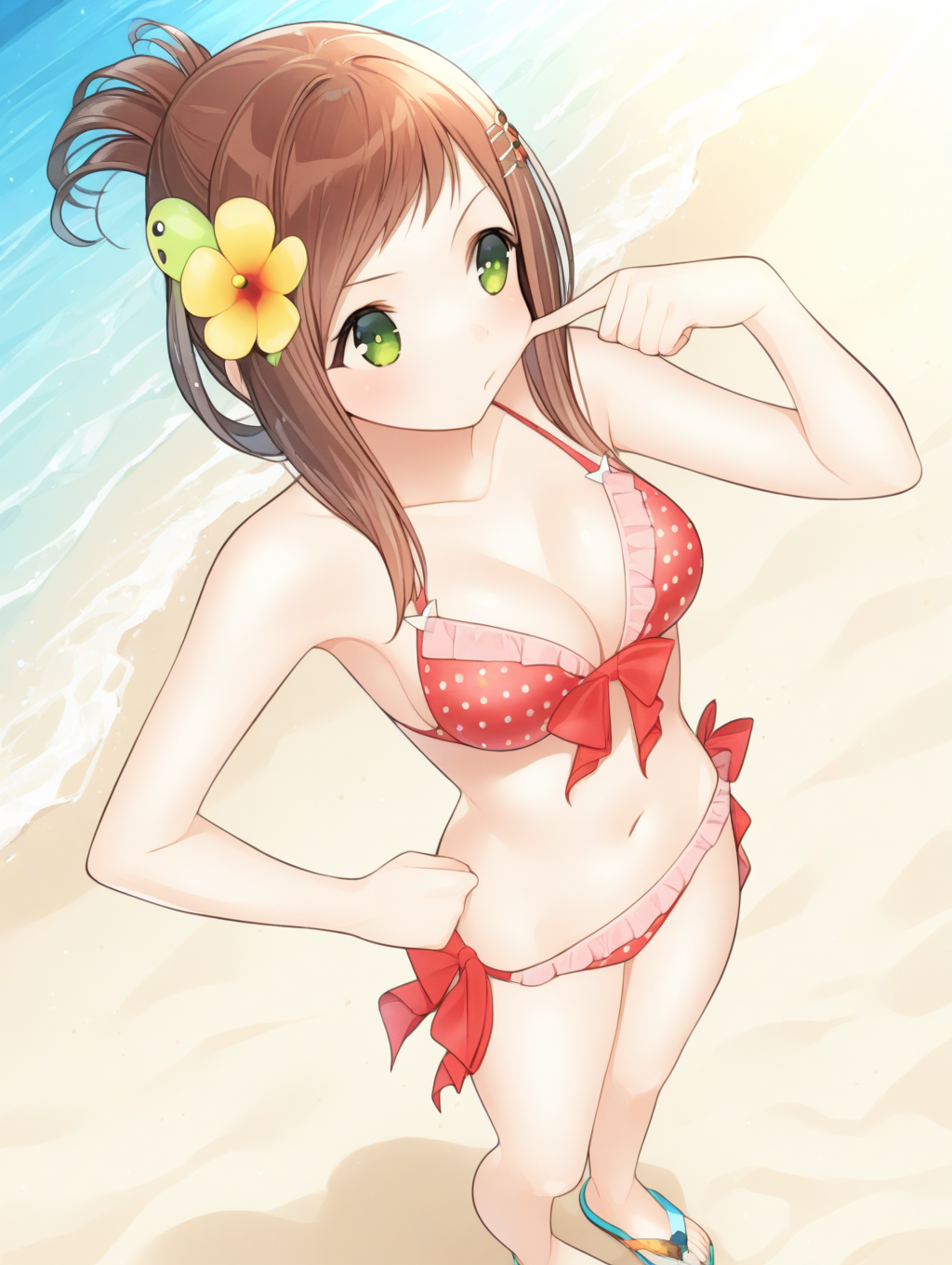 プロンプト例: natu,polka dot bikini,ribbon,hair ornament,sandals,solo,ocean,beach,green eyes,updo,