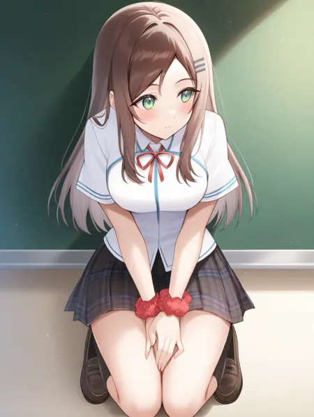 プロンプトの例: seisyunn,長い髪,髪飾り,学ラン,プリーツスカート,ミニスカート,靴下,ローファー,短袖,スクランチ,緑の目,リストバンド,教室,