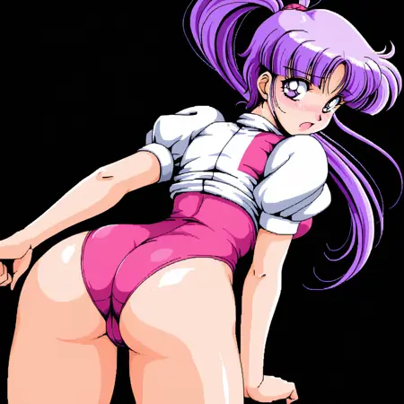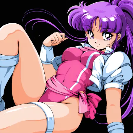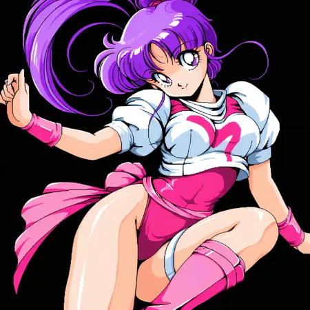 ポニーテール、レオタード、笑顔、レトロアートスタイル、太ももストラップ、ブーツ、ピンクのレオタード、白い短い袖、白いふわふわ袖、ベルト,