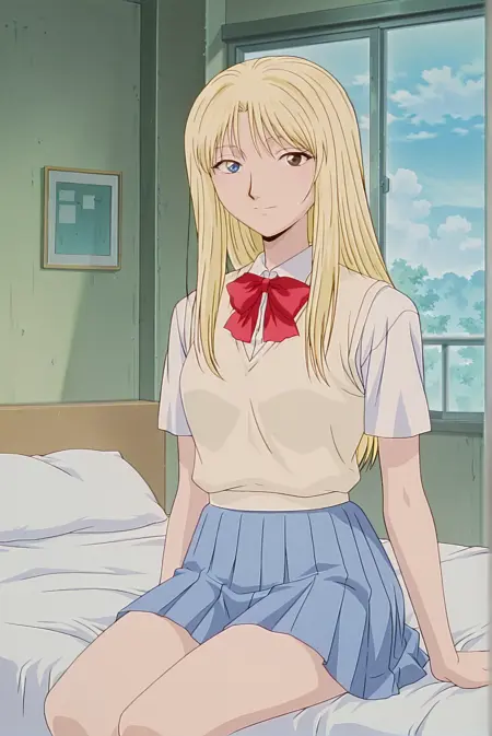 학교: urumi-ka, 1girl, 이색안색, 왼쪽 파란 눈, 오른쪽 갈색 눈, 금발, 긴 머리, 치마, 학교 유니폼, 흰 셔츠, 반소매, 조끼, 빨간 리본, 파란 치마, 주름치마, 양말, 신발
