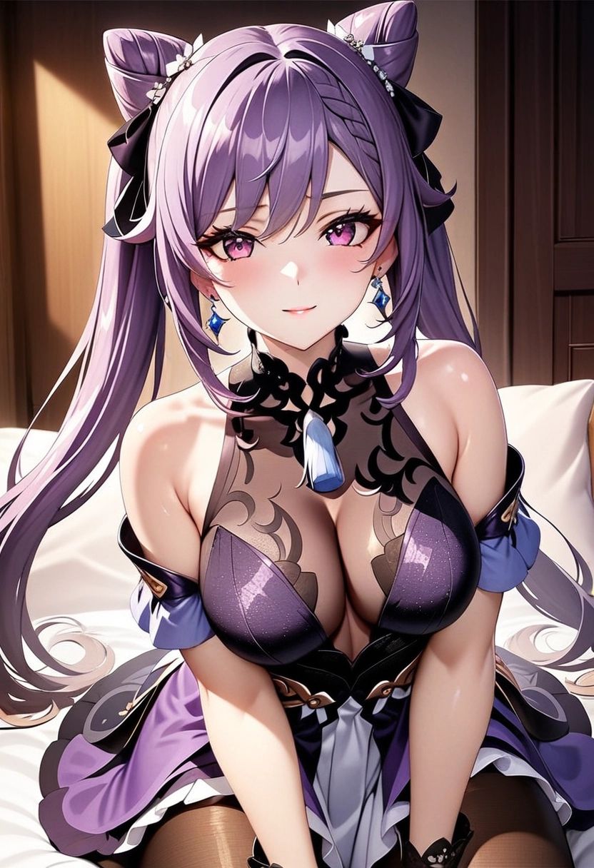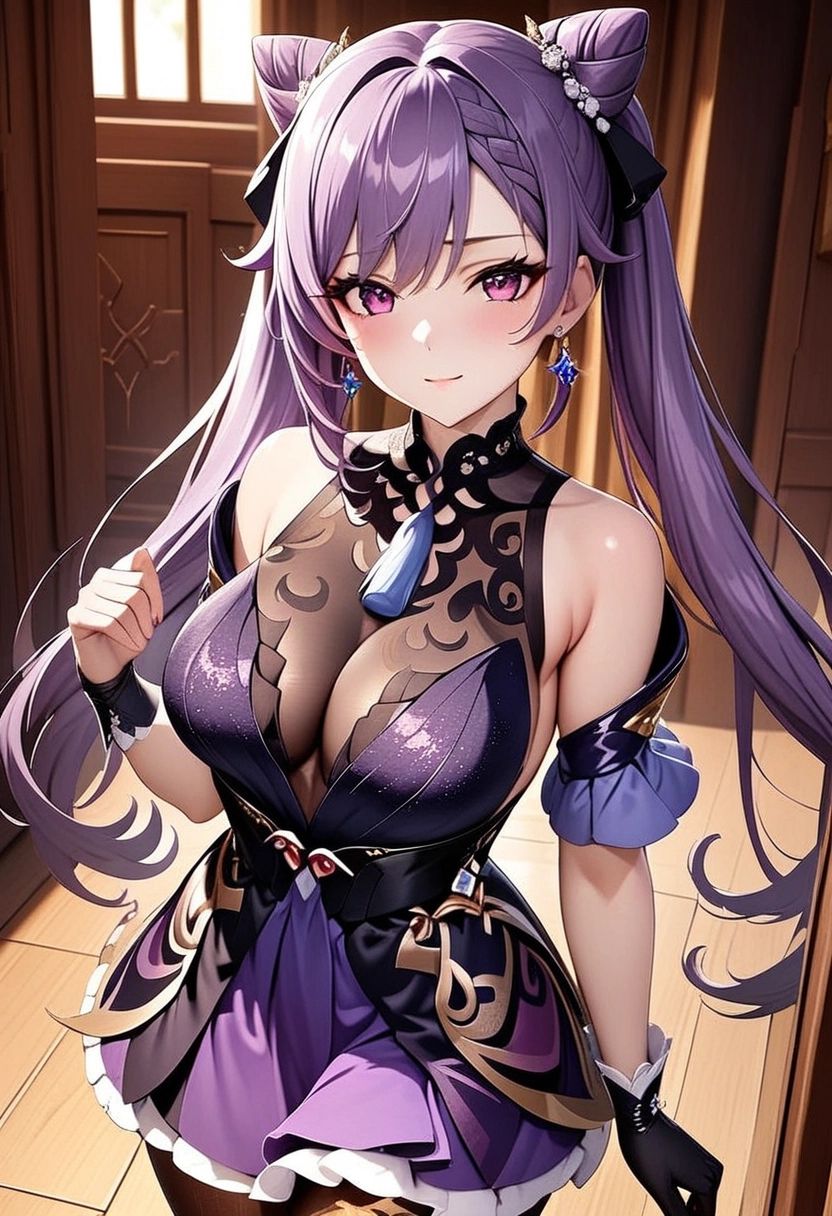 Trigger words: keqing_a_xl, long hair, purple hair, hair bun, cone hair bun, twintails, bangs, purple eyes, hair ornament, jewelry, earrings, keqing(Genshin) Dress, dress, purple dress, frills, bare shoulders, black gloves, black pantyhose
