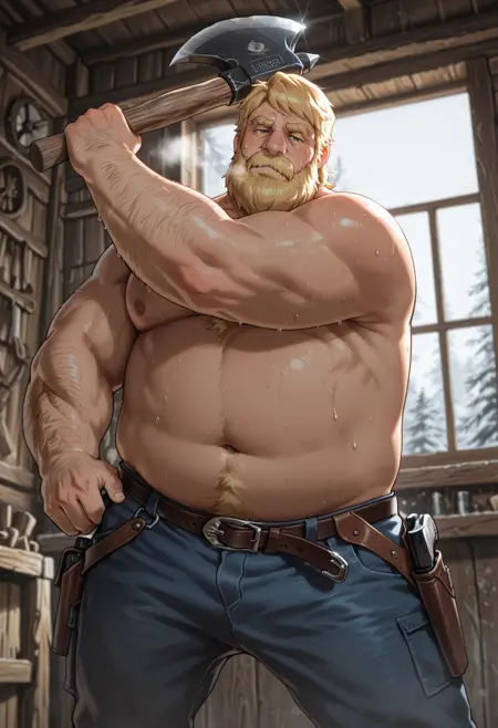 hawk_lp, solo, blonde hair, shirt, 1boy, looking_at_viewer, male focus, belt, pants, facial hair, denim, red shirt, beard, jeans, mustache, blue pants, fat