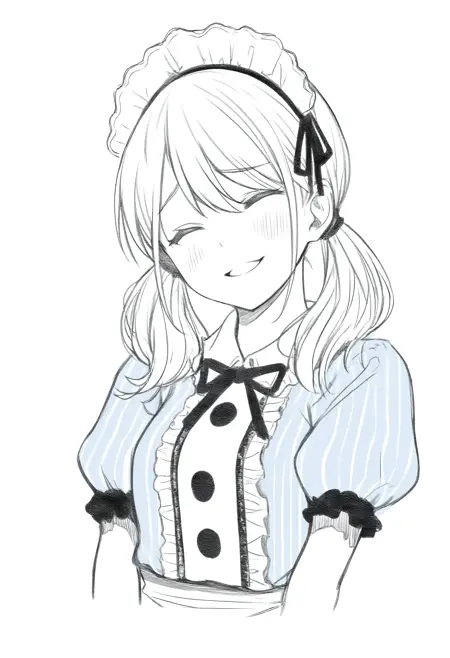 Tsuk1sh1maRiho, green eyes, orange hair, long hair, twintails, maid headdress, black ribbon, striped dress, blue dress, center frills, puffy short sleeves, white apron, pantyhose