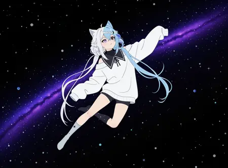 multicolored hair, white hair, blue hair, two-tone hair, very long hair, braid, animal ears, cat ears, hair ornament, hair between eyes, low twintails, heterochromia, purple eye, black eye, covered neck, black sailor collar, bare shoulders, white oversize sweater, sleeves past fingers, asymmetrical legwear, mismatched legwear, single black thighhigh, grey sock, bike shorts