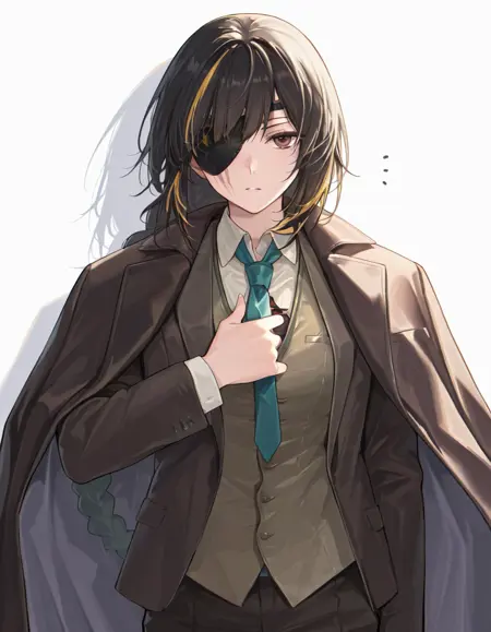 SpecialAgentGetNoDayOff, SAG_coat, coat on shoulders,SAG_white_shirt, SAG_necktie, SAG_vest, open blazer, SAG_blazer, SAG_pants, SAG_boots, def_eyepatch