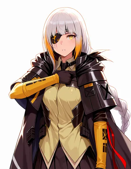 m16boss, boss_eyepatch, boss_shirt, boss_coat, boss_capelet, boss_yellow_sleeves, boss_black_arm_ribbon, boss_thigh_holster, def_single_cropped_pantyhose, boss_gloves, boss_skirt, boss_necktie, boss_boots, boss_knee_pads, boss_red_arm_ribbon