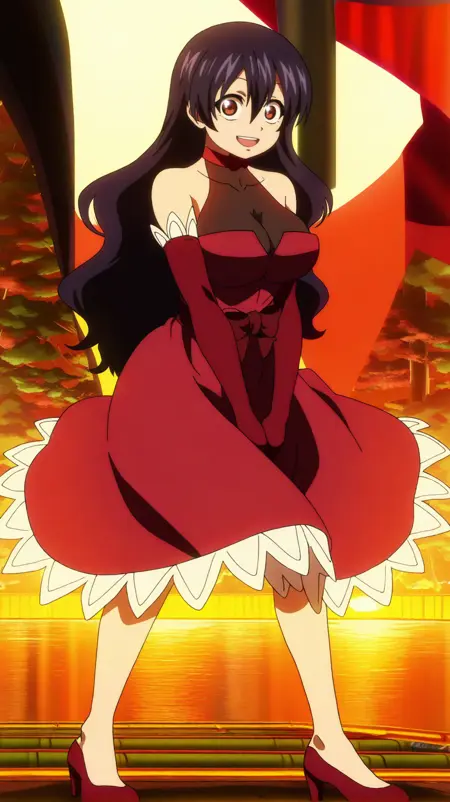 ドレスの服装、 Dress、赤いドレス、サッシュ、赤いサッシュ、チョーカー、赤いチョーカー、胸、大きい胸、谷間、赤い手袋、肘まである手袋、ハイヒール、赤いヒール、