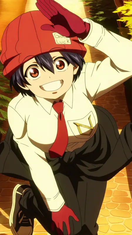 ユニオンの服装、シャツ、赤い手袋、長袖、ネクタイ、靴、ズボン、赤いネクタイ、腰周りの服、腰周りのジャケット、ビーニー、
