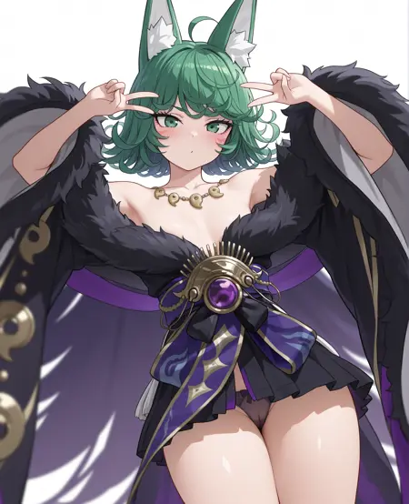スカート、ロングスリーブ、胸元の開き、肩出し、ジュエリー、パンティ、太もも、和服、広い袖、黒いスカート、着物、ネックレス、肩出し、ファーの縁取り、勾玉、短い着物、勾玉ネックレス、低めの衿元、ファー縁取りの着物,