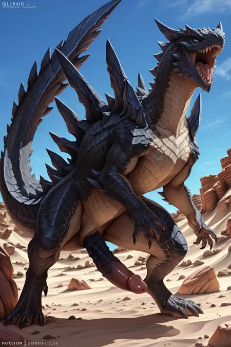 人形,体型庞大且肌肉发达,趾行性腿部,粗壮尾巴末端带巨大剑状刃片,长角爬行类头部,锋利牙齿,铠甲鳞片,肩部有尖刺状护甲板