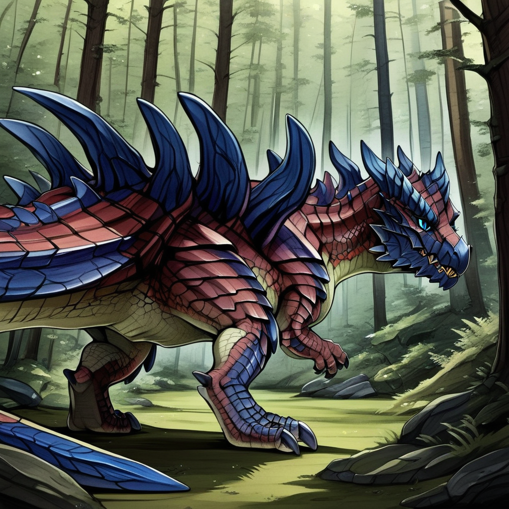 anthro、巨大な筋肉質な体格、足指歩行、大型の剣のような刃が付いた太い尾、角のある爬虫類のような頭部、鋭い歯、装甲鱗、肩にトゲのある装甲板
