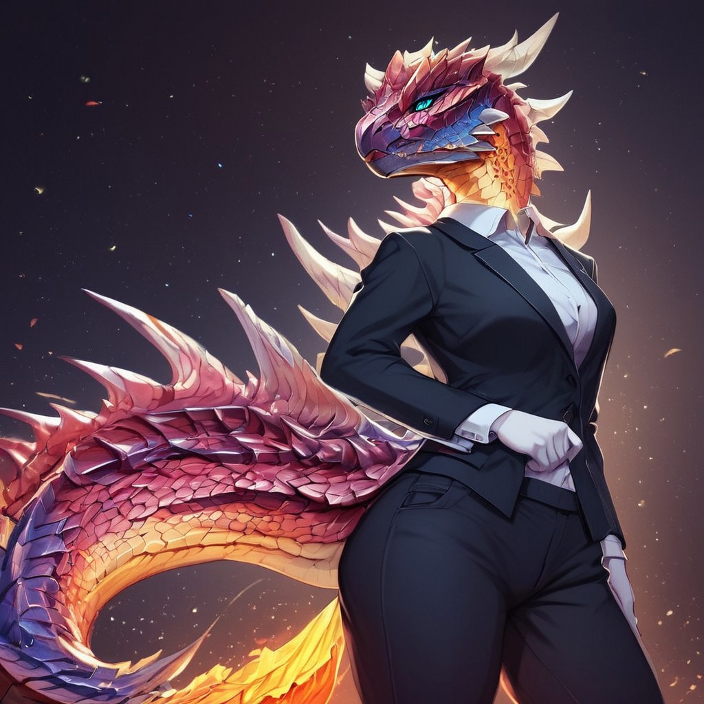 エフェクトバリエーション: 尾から火花が飛散、鱗に溶岩のような亀裂、尾の発光が赤から白熱するグラデーション