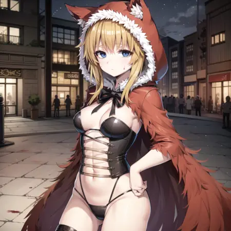 illustrations of a female cartoon figure on a city background, wearing a furry corset, 1girl, blue eyes, blonde hair, blood, hood, thighhighs, solo, outdoors,