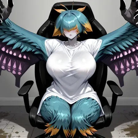 触发词: Yanzhi、怪物女孩、鹰身女妖、羽毛、灰色皮肤、多色头发、蓝黄色头发、触角、头发遮眼、短发、乳房、下乳、带翼手臂、羽毛翅膀、爪状手、高跟鞋