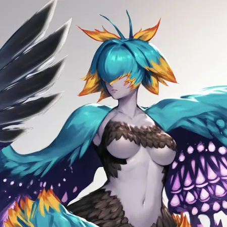 触发词: Yanzhi、怪物女孩、鹰身女妖、羽毛、灰色皮肤、多色头发、蓝黄色头发、触角、头发遮眼、短发、乳房、下乳、带翼手臂、羽毛翅膀、爪状手、高跟鞋