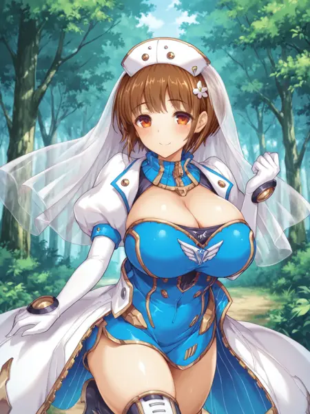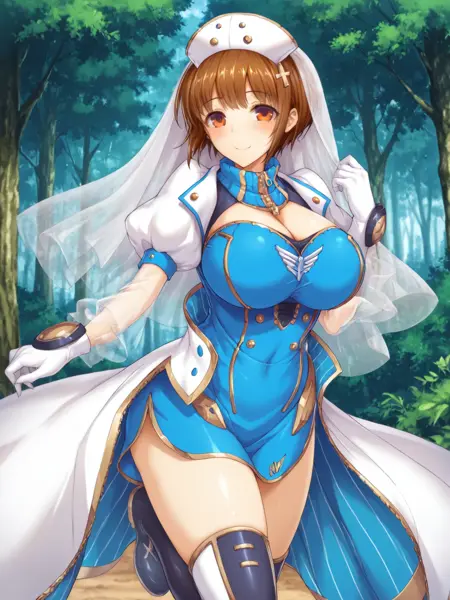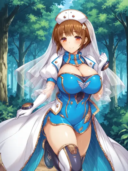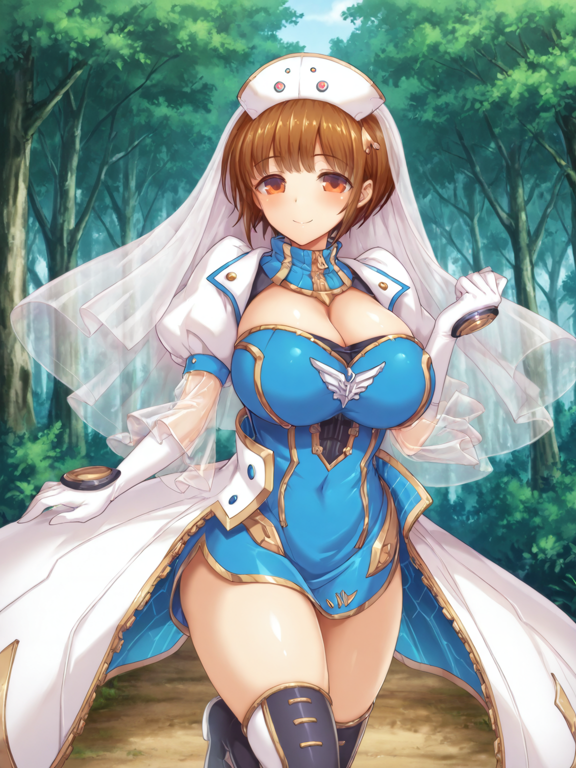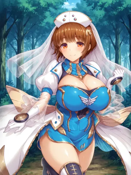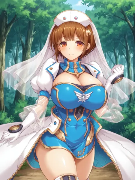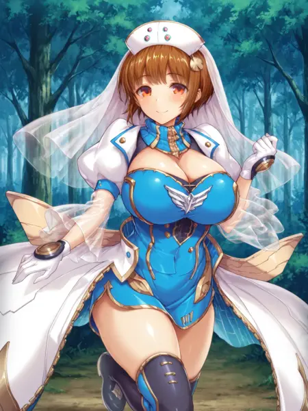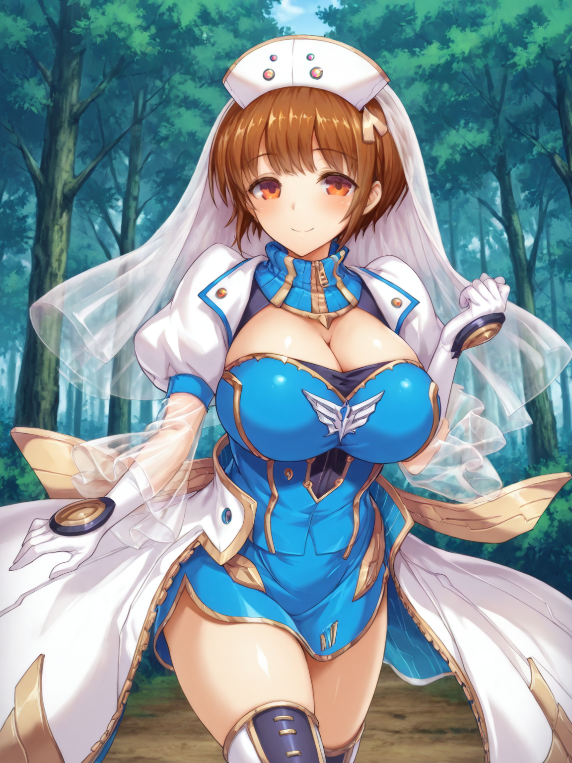 nike, orange eyes, brown hair, short hair, neck length hair, one-san style, big breasts, thick thighs, big eyes, curvy body, nurse costume, blue dress,golden accents, cap, veil, gloves, thigh-high boots,