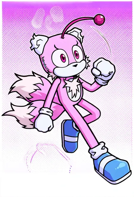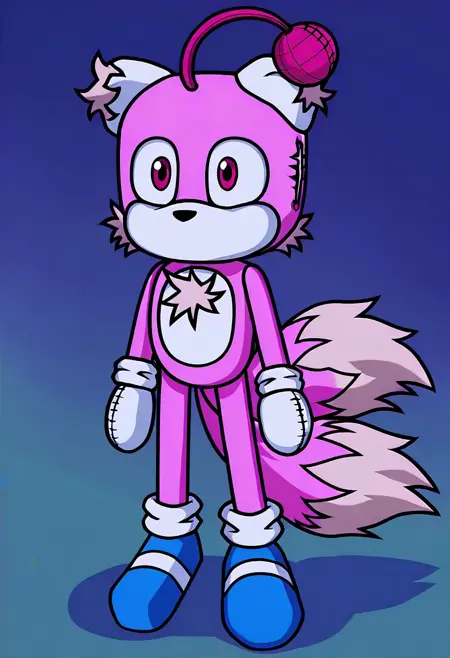B3TailsFNF, 1boy, light pink fur, fewer stitches and sewing needles on body, torn apart, spherical dark reddish-pink antenna, dark reddish pink eyes, blue shoes, plush, doll, no humans, tails the fox, sonic the hedgehog, mouthless,