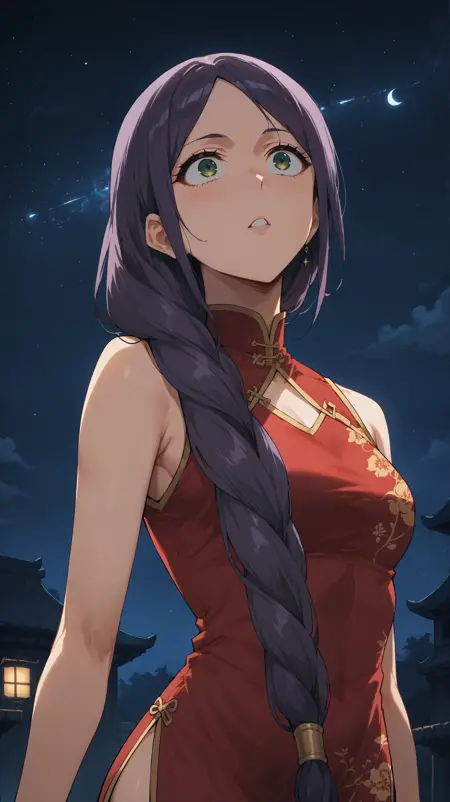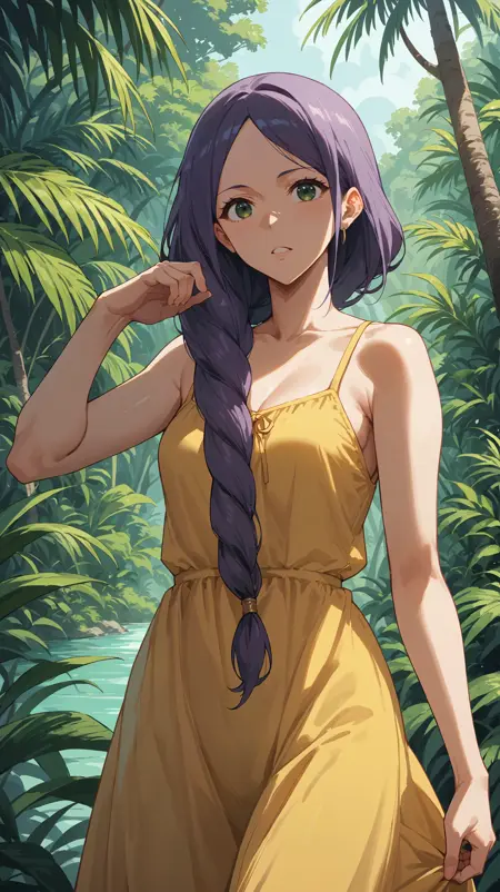 Se-Mi Han, semi_han_sl, long hair, purple hair, long braid, purple braid, dark green eyes, dark purple dress, multicolored capelet, purple capelet, long sleeves, white gloves, earring, high collar,