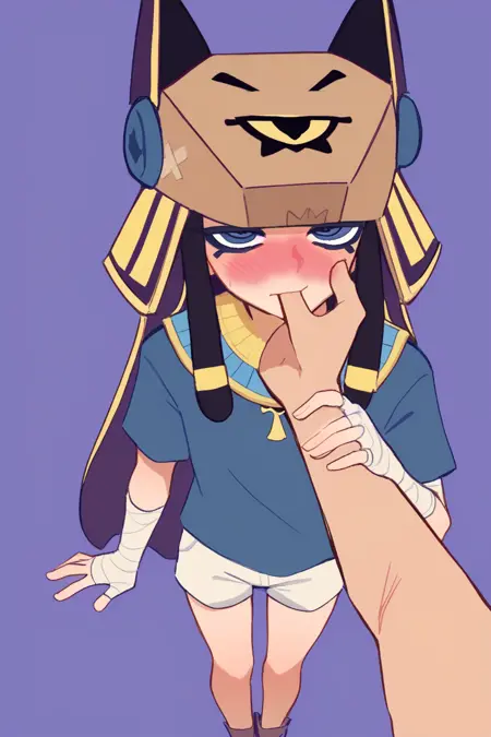 1boy ,bsfinx,cardboard helmet, fake ears,black hair, blue shirt, white shorts,purple cape, egyptian, egyptian clothes,ankh, bandages , solo