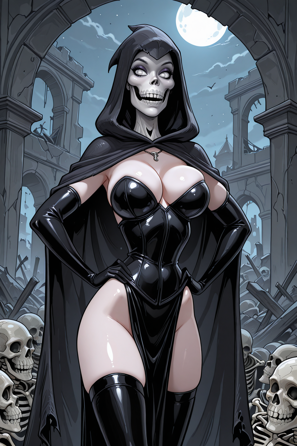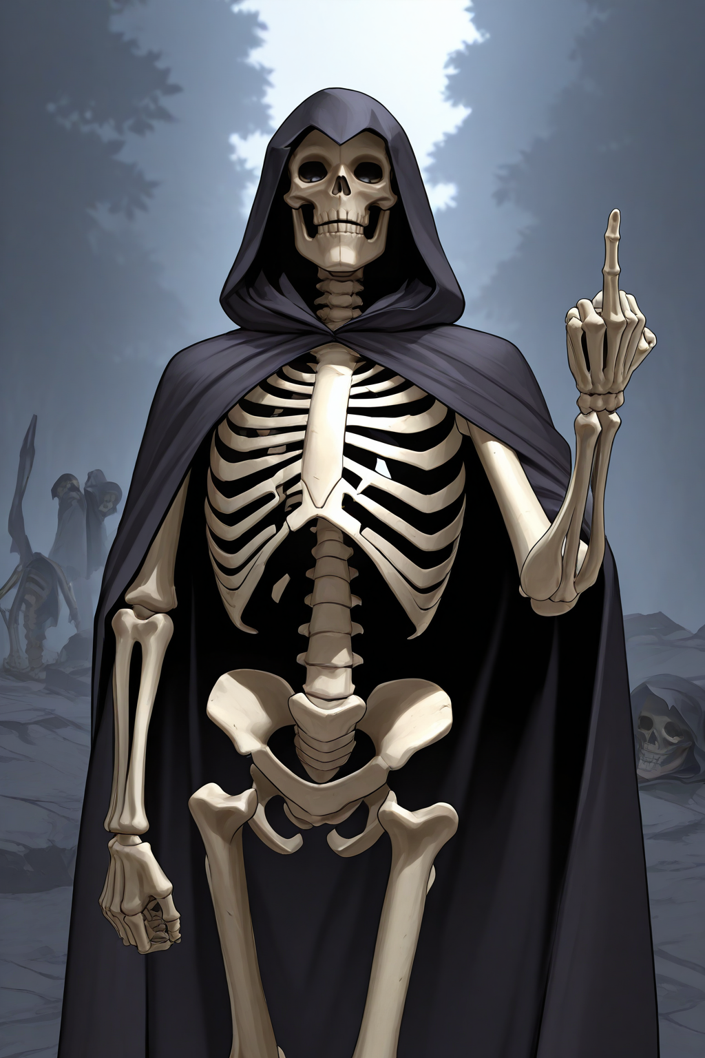 클래식한 죽음의 외모 트리거: mstrssdeth, 후드 올림, 후드 달린 망투, 두개골 머리, 드레스, 골격, 찢어진 옷, 동공 없음, 검은 눈, 인간 아님