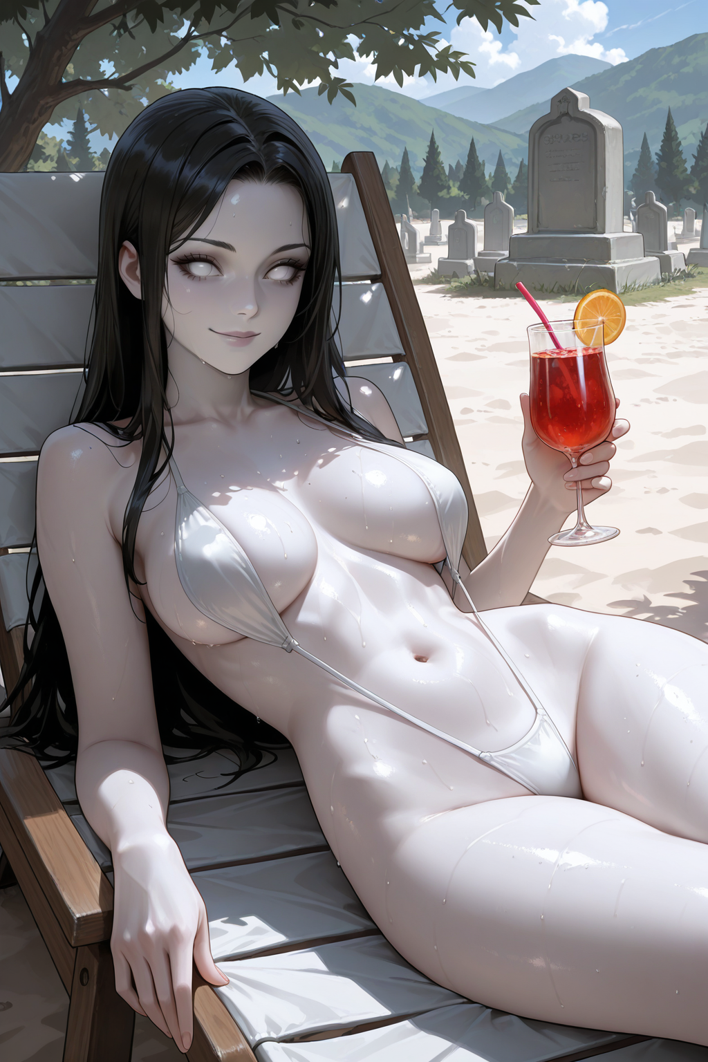 클래식한 과감한 죽음 트리거: mstrssdeth, 후드 올림, 후드 달린 망투, 색이 있는 피부, 두개골 머리, 하얀 눈, 동공 없음, 팔꿈치 장갑, 버스티어, 가슴 선, 허벅지 긴 양말, 골반 커튼