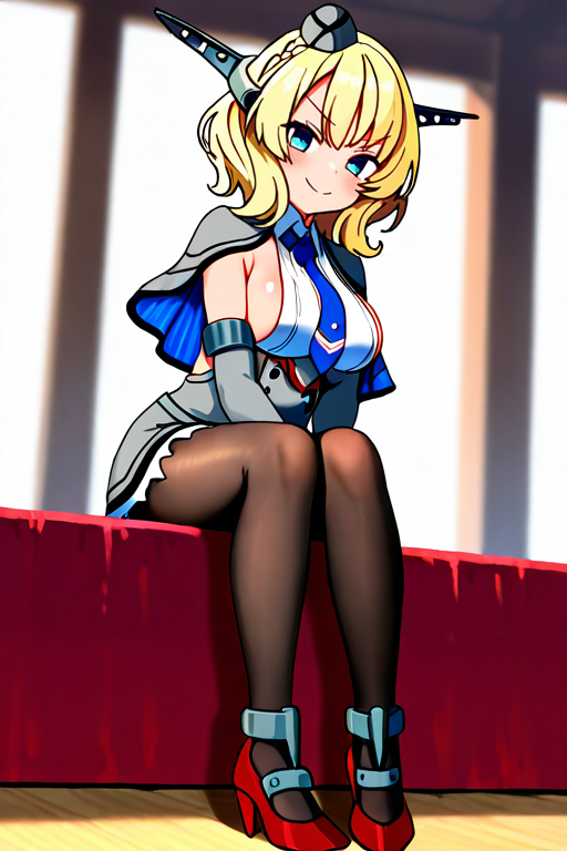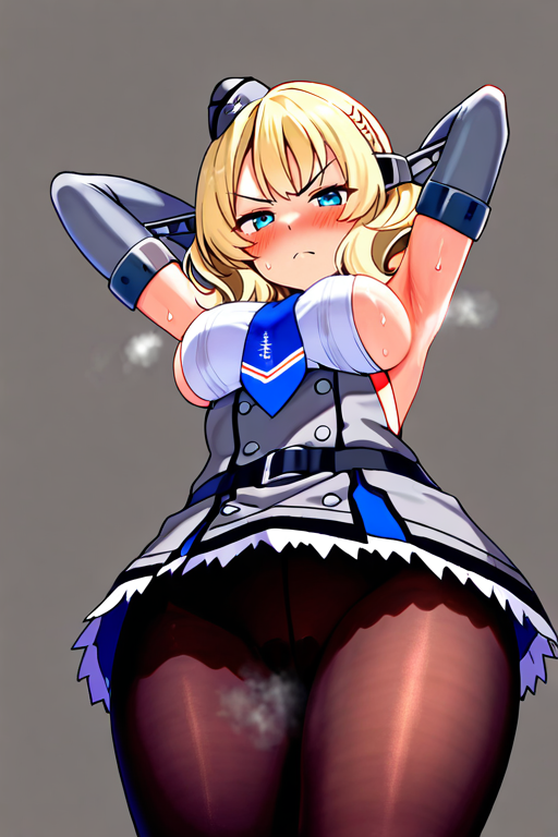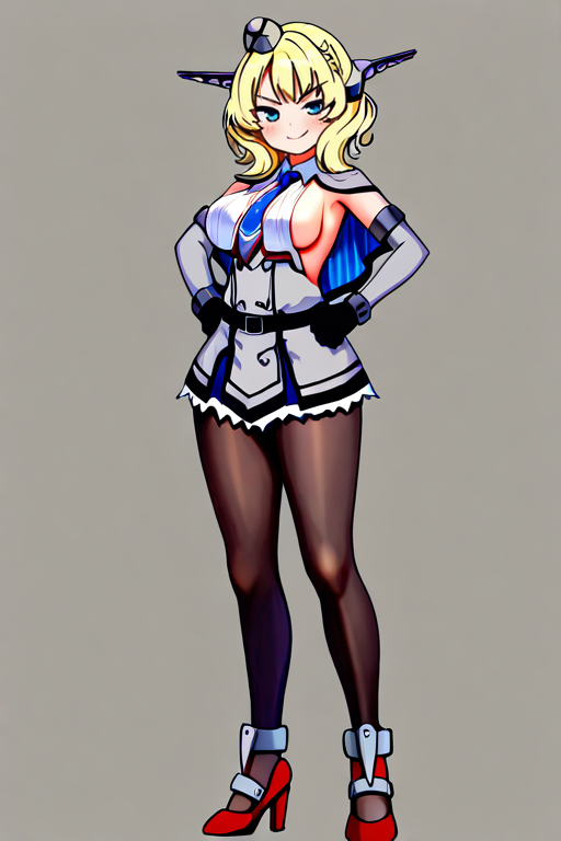 大乳房,coloradodef,无袖,侧露乳,无袖上衣,白色上衣,百褶裙,蓝色领带,灰色裙子,肘部护臂,黑色手套,黑色连裤袜,高跟鞋,舵形鞋,红色鞋子,小斗篷,