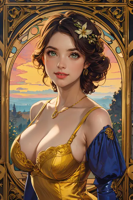 Semirealistic model for a Mucha style. Use this prompt for your pics.
