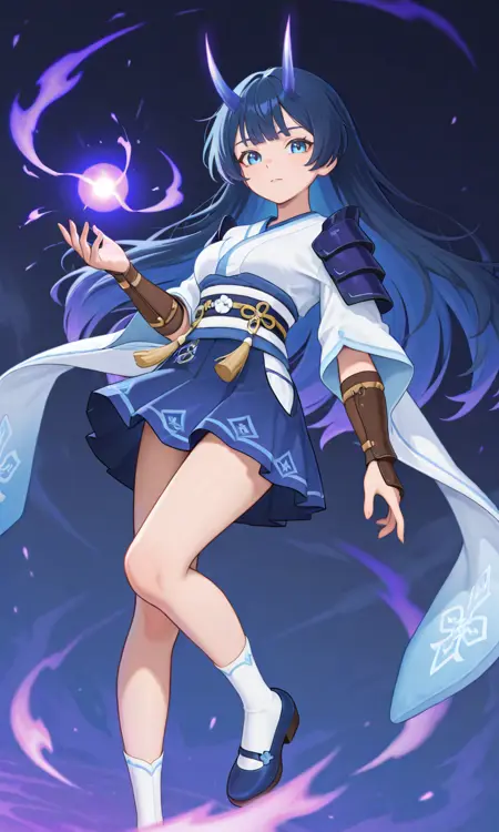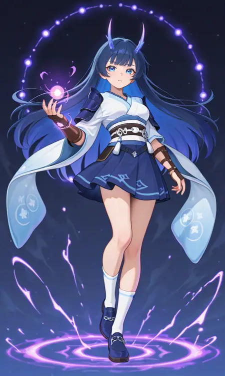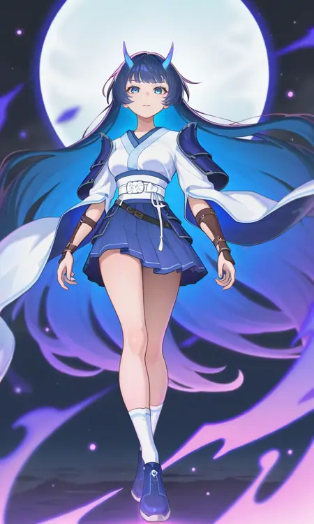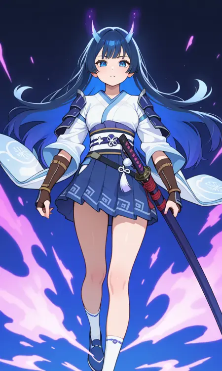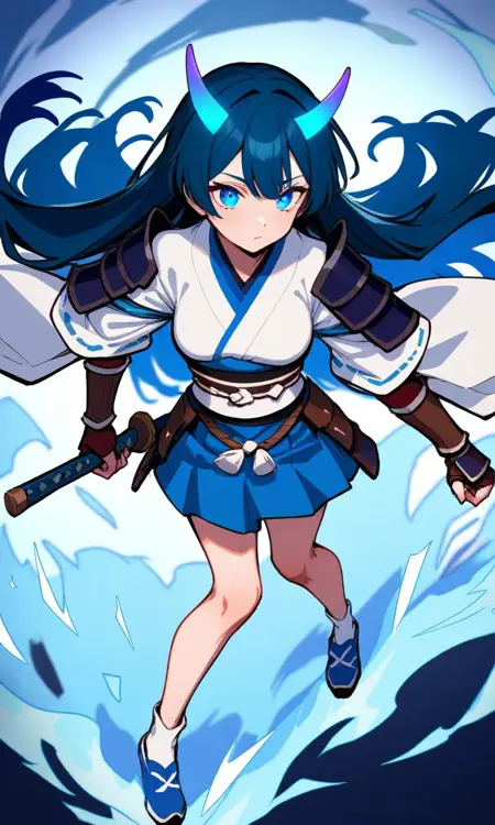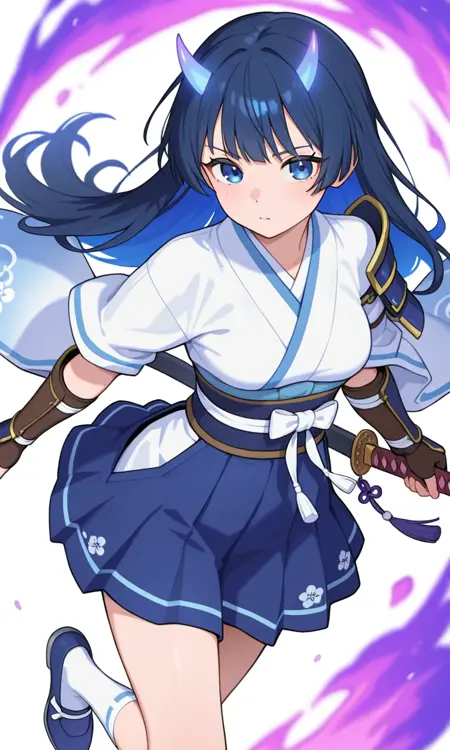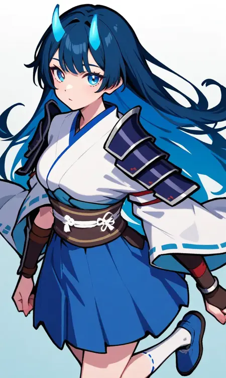 SayaIC, blue horns, blue eyes, blue long hair, bangs, dark blue shoulder armor, white kimono, white obi, blue skirt, white socks, blue shoes, brown forearm gauntlet, medium breasts
