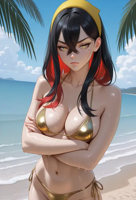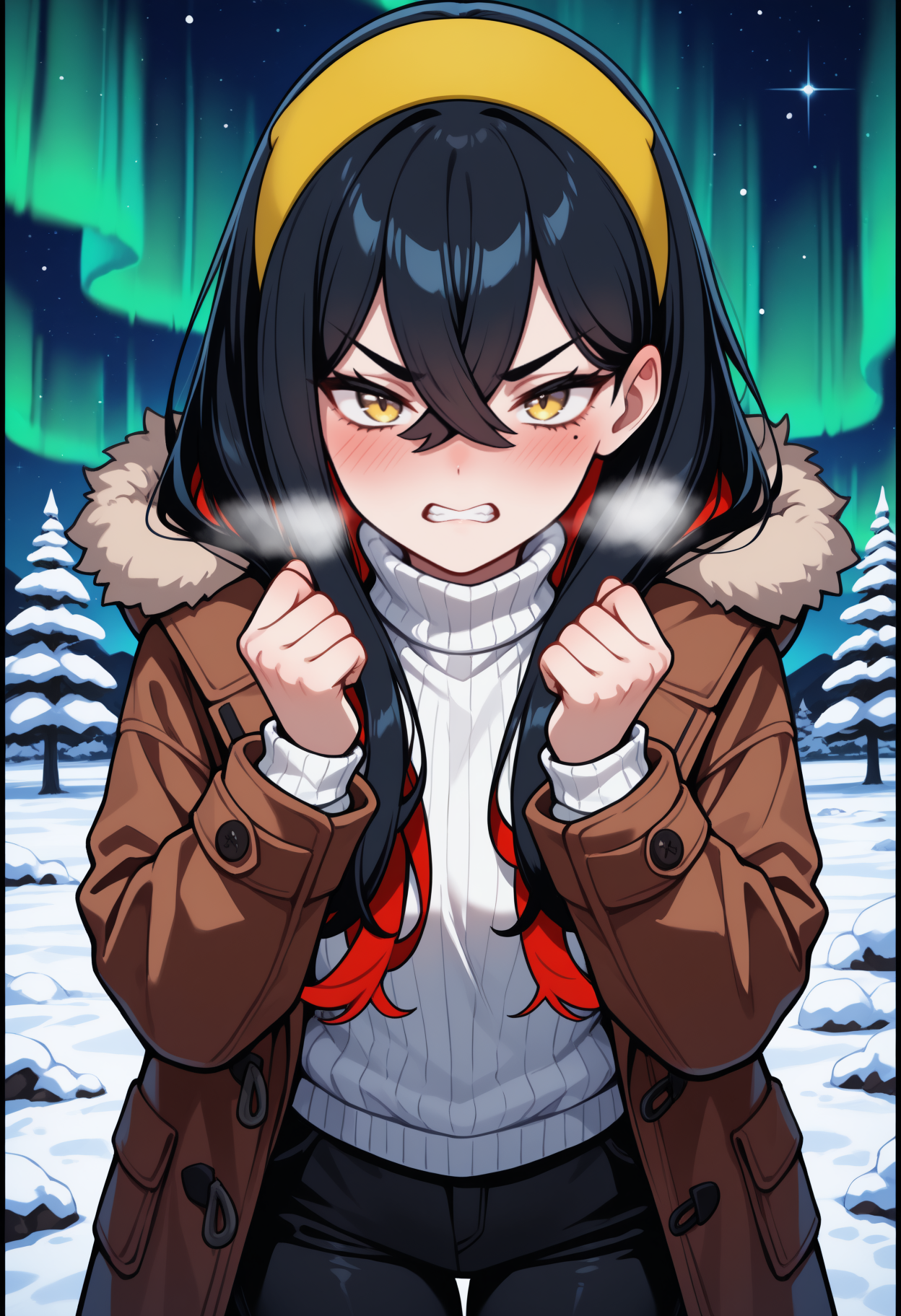 기본 복장: crmndef, 눈 밑 점, 긴 머리, 색상 내부 머리카락, 검은 머리, 빨간 머리, 눈 사이 머리카락, 십자 앞머리, 노란 헤어밴드, 노란 눈, 속눈썹, 파란 재킷, 긴 소매, 빨간 장갑, 단일 장갑, 부분적으로 손가락이 없는 장갑, 단추, 파란 바지, 흰색 벨트, 노란 가방, 허리 가방