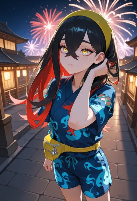 티올 마스크: crmnteal, 눈 밑 점, 긴 머리, 색상 내부 머리카락, 검은 머리, 빨간 머리, 눈 사이 머리카락, 십자 앞머리, 노란 헤어밴드, 노란 눈, 속눈썹, 일본식 옷, 파란 셔츠, 프린트 셔츠, 짧은 소매, 십자 끈으로 묶인 소매, 파란 반바지, 프린트 반바지, 노란 가방, 허리 가방