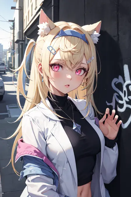 "FuwawaAbyssgard, hairband, hairclip, chained belt collar, black jacket, fur-trim, blue belt, white dress, cleavage cutout"
