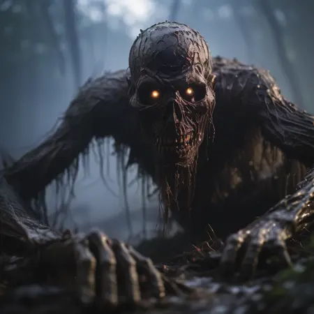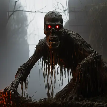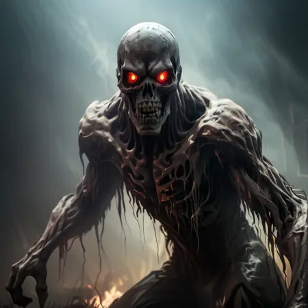 1boy, bald, blurry, claws, crawling, depth of field, empty eye sockets, ghast, glowing, glowing eyes, looking at viewer, male focus, open mouth, reaching out, red eyes, solo, standing