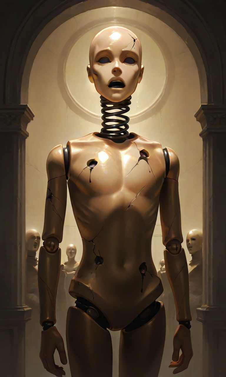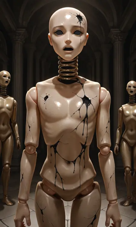 Coil-Heads, also known as Spring Men and Mannequins, are tall, humanoid entities in Lethal Company. They are eyeless mannequins with agape mouths, no forearms and a flexible spring for a neck. Their bodies are punctured with nails that are surrounded by what seem to be stains of blood. They are about double an Employee's height.