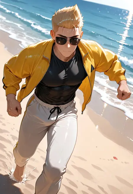 服装:黄色夹克,黑色衬衫,黄色长裤,墨镜,包,携带一个运动风格的灰色单肩包,黑色袜子,黄色运动鞋,