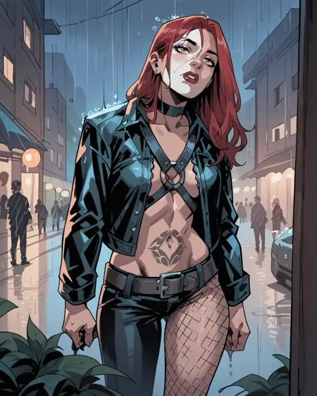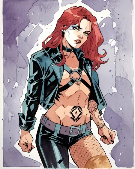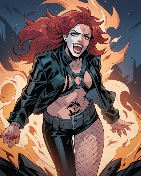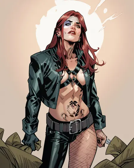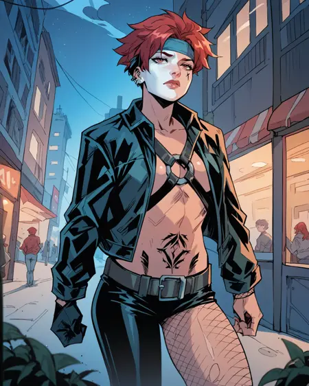 트리거: typhoidmary, 빨강 머리, 긴 머리, 얼굴 페인트, 재킷, 하네스, 바지, 비대칭 옷, 문신, 피시넷