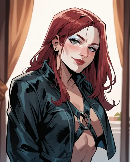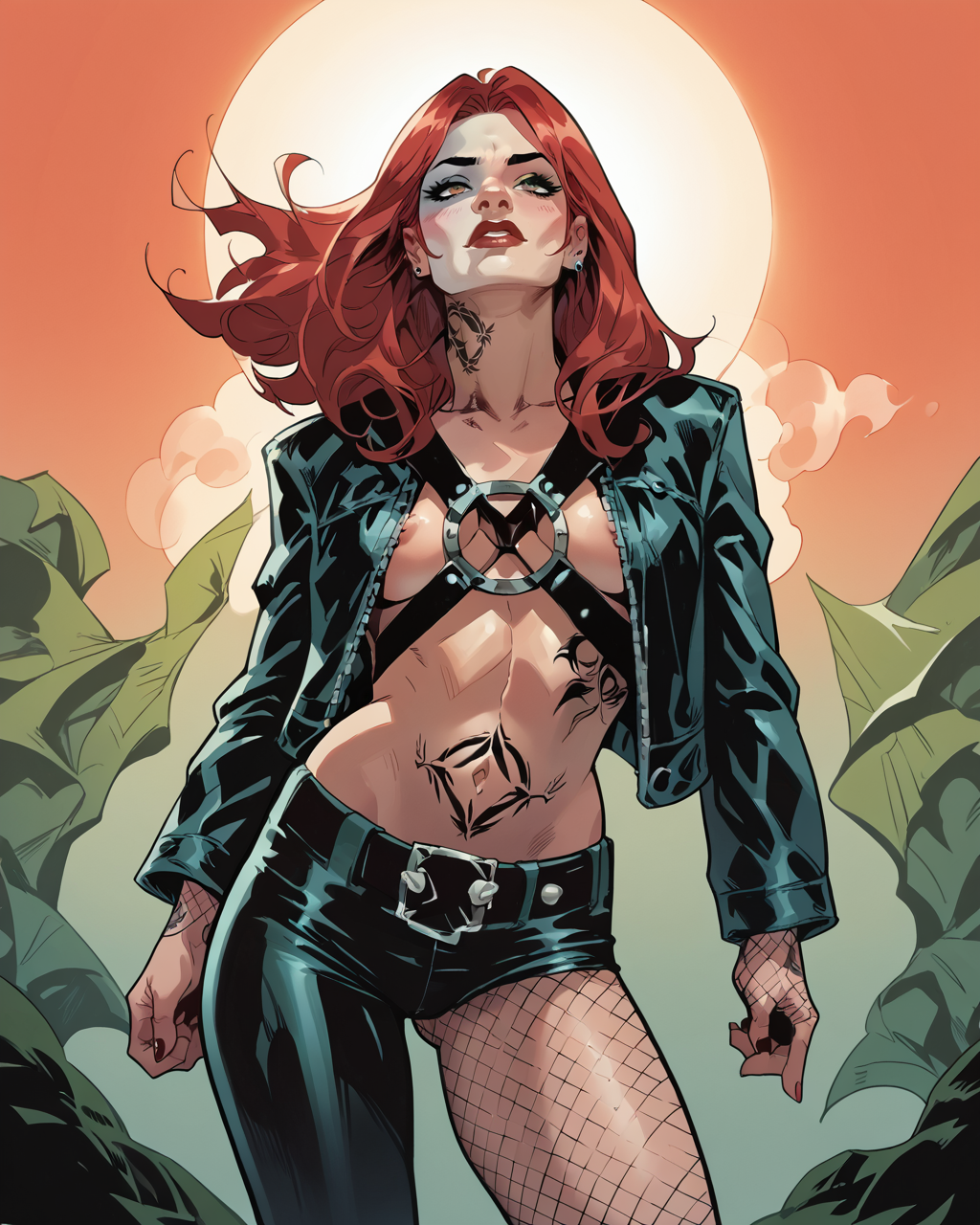 触发词:typhoidmary, 红发, 长发, 面部彩绘, 夹克, 背带, 裤子, 不对称服装, 纹身, 鱼网袜