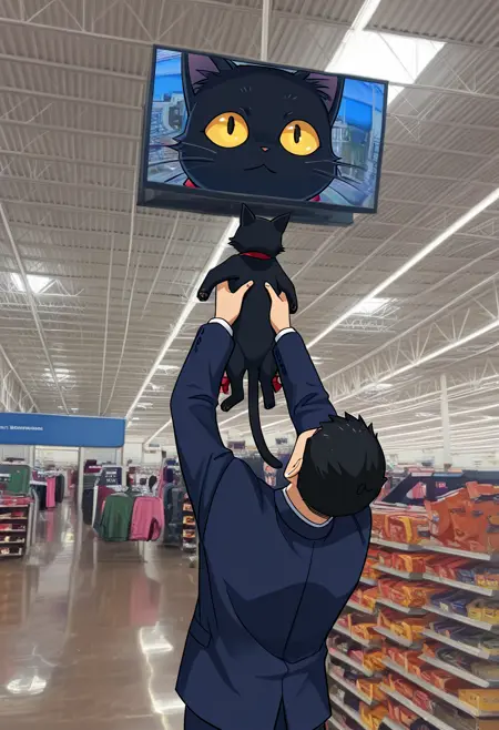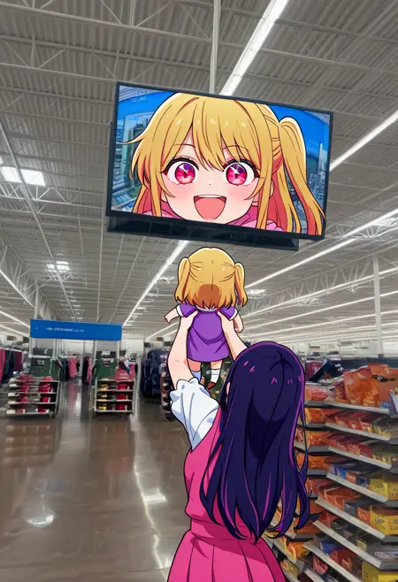 Trigger word: showing_baby_to_a_supermarket_camera_(meme), screen, television, lifting person, supermarket, photo background,