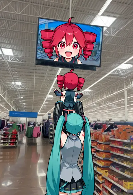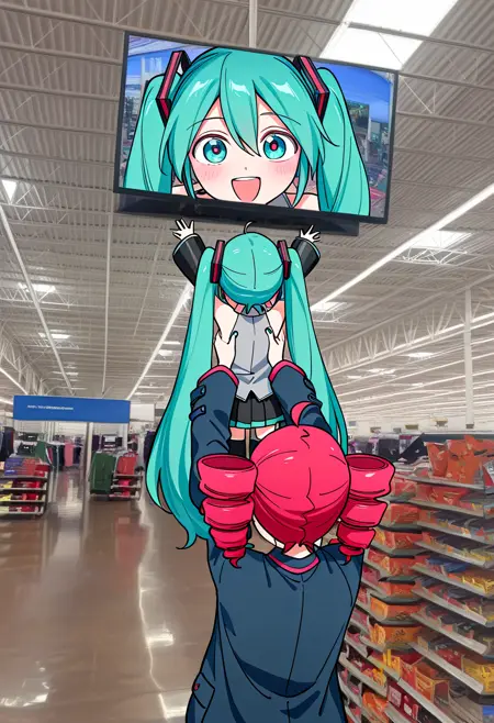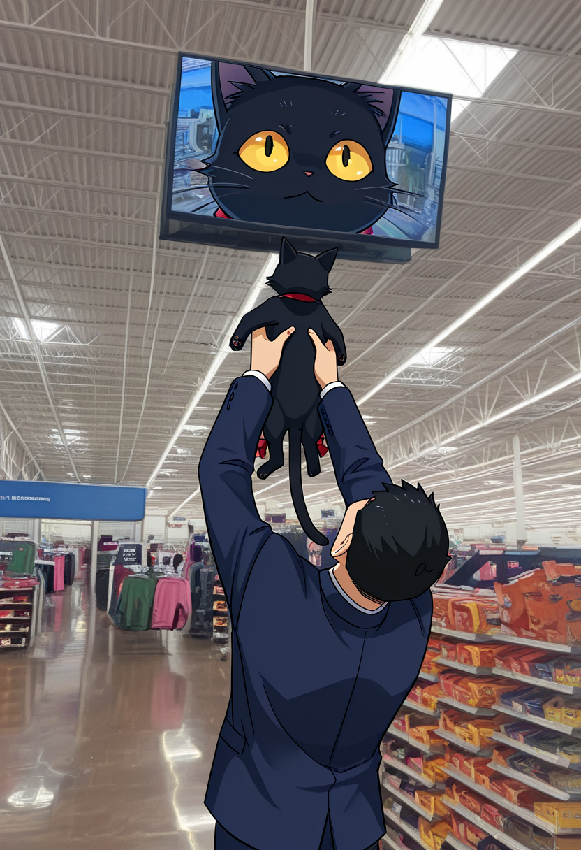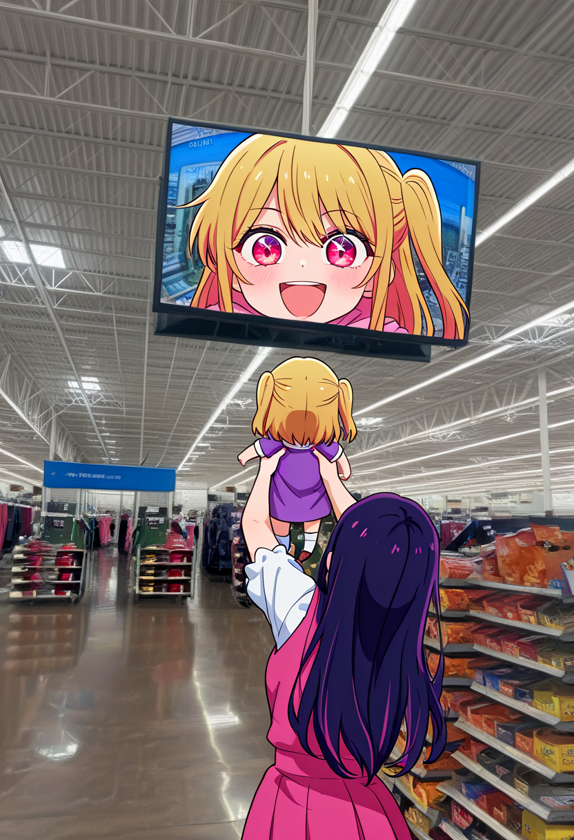 触发词:showing_baby_to_a_supermarket_camera_(meme),屏幕,电视,举起的人,超市,照片背景,