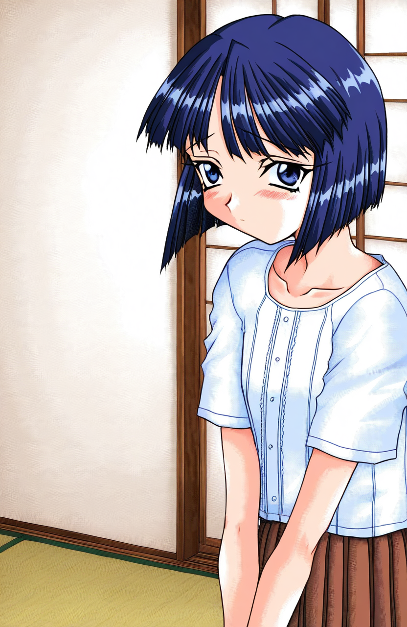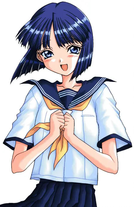 Kashiwagi_Kaede(Kizuato), 1girl, solo, short hair, blue hair, blue eyes, bob cut, bangs, flat chest,