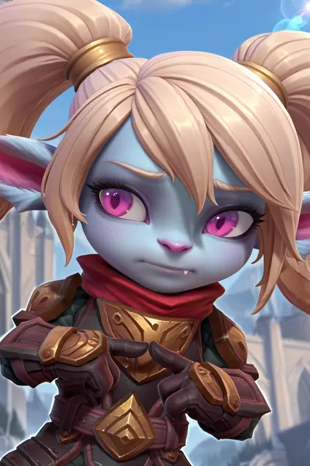 Default Prompt: oms_poppy, furry, yordle, big head, single fang, pink eyes, blue fur, pigtails, colored skin, pointy ears, animal ears, armor, holding, hammer,