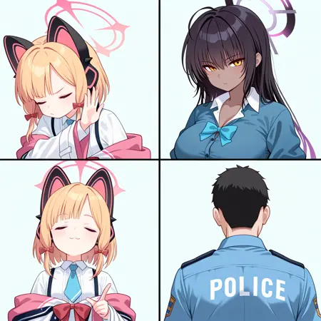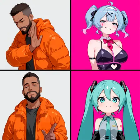 トリガー語: drakeposting_meme, 4コマ, 簡単な背景, 目を閉じた, 指差し, y