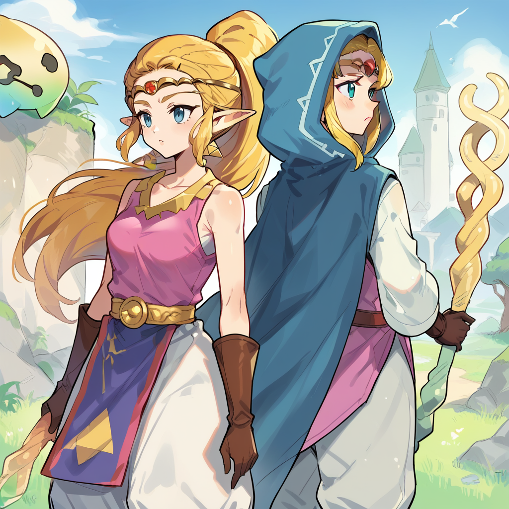 모험 복장: 프린세스 제르다, 파란 눈, 뾰족한 귀, 높은 팔자 머리, 금발 머리, 소매 없음, 갈색 장갑, 흰 바지, 원형 관모, collarbone, 트라이포스, 갈색 부츠, 타바드, 드러난 어깨, 분홍 셔츠, 벨트,