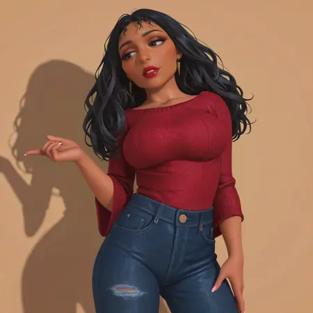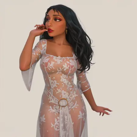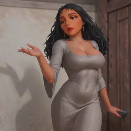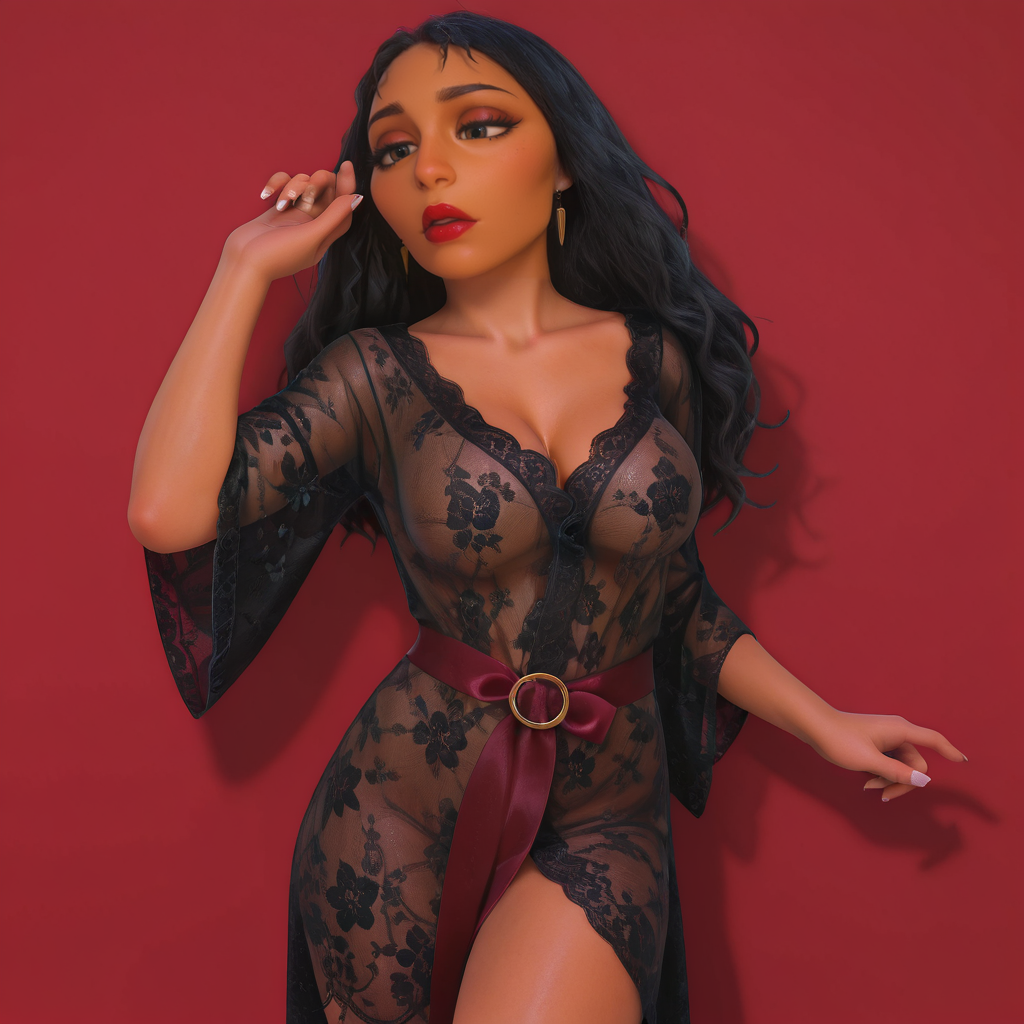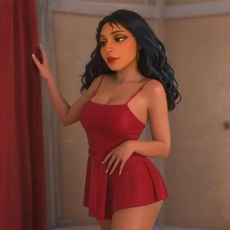 트리거: mothergothel, 1girl, jewelry, earrings, red dress, makeup, long hair, black hair, lipstick, long sleeves, breasts, fingernails, dark skin