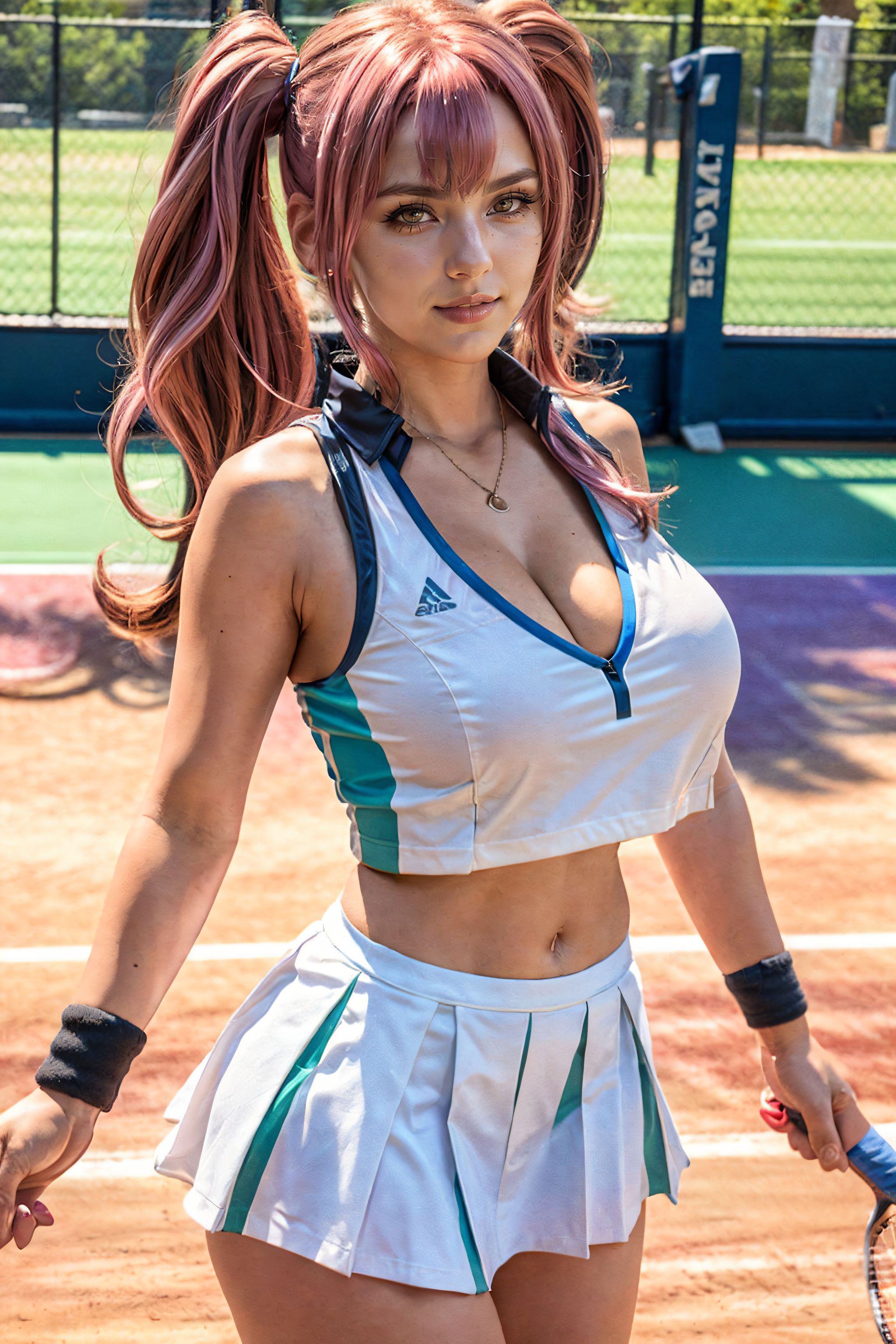 SDポジティブプロンプト: LORA, realistic, masterpiece, realistic, detailed, 8k, 1girl, beautiful photography of bremerton, hair between eyes, pink hair, twintails, cleavage, hair ornaments, hair clips, tennis sportwear, miniskirt, white shirt, large breasts, smile..