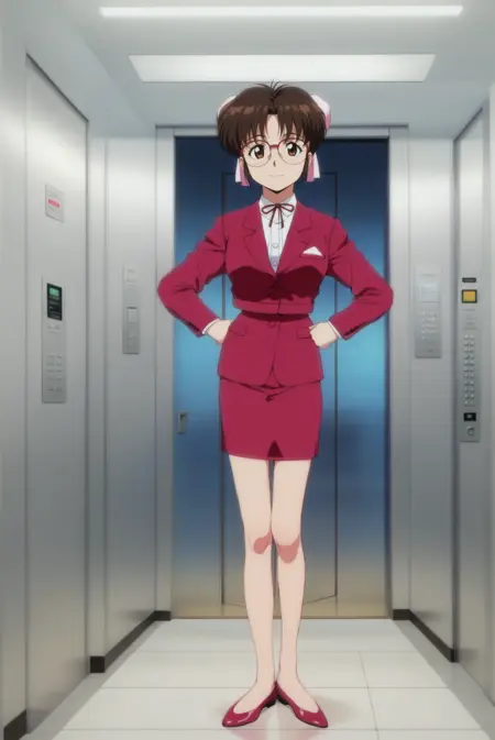 사토 유리 회사 복장: 사토, 안경, 머리빗, 갈색 머리, 갈색 눈, 정장, 빨간 정장, 빨간 넥타이, 리본, 치마, 레트로 아트스타일, 1990년대(스타일)