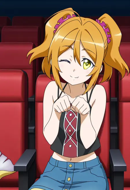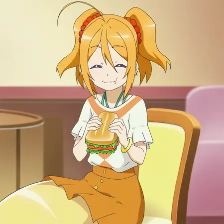 Alternate outfit: T-shirt, frills, orange skirt, bracelet, bra straps