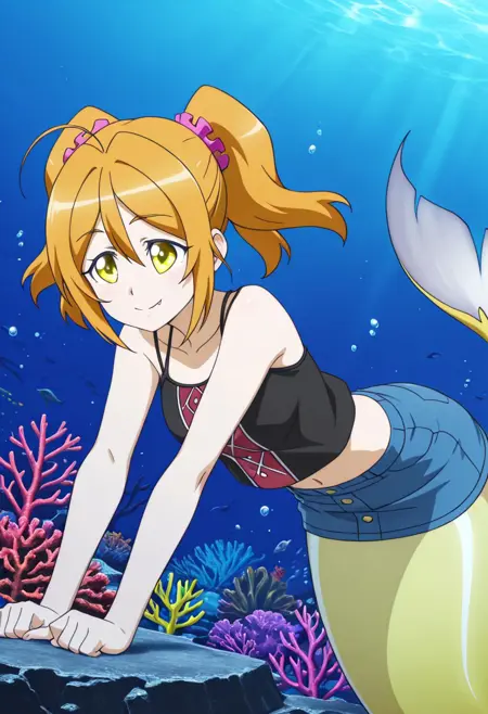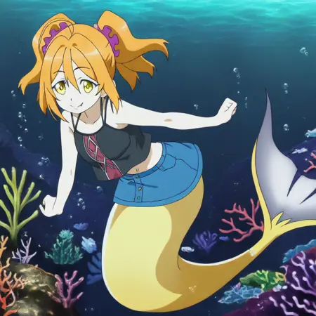 Appearance: orange hair, pigtails, ahoge, hair scrunchies, yellow eyes, single fang, monster girl, mermaid, mermaid tail, yellow tail