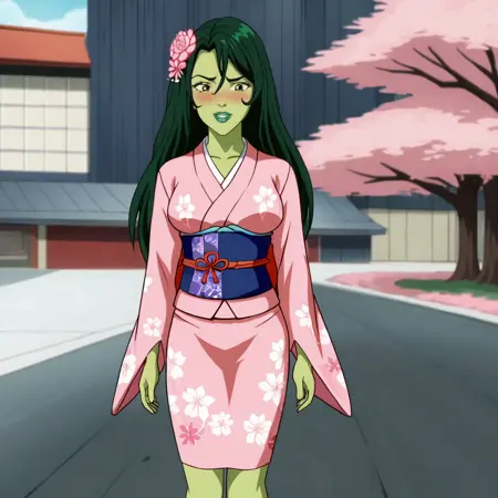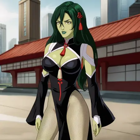 Trigger: SheHulkFantasticFourShow, 1girl, green hair, green skin, superhero, long hair, cape, black hair, leotard, breasts, lipstick, bodysuit, cowboy shot
