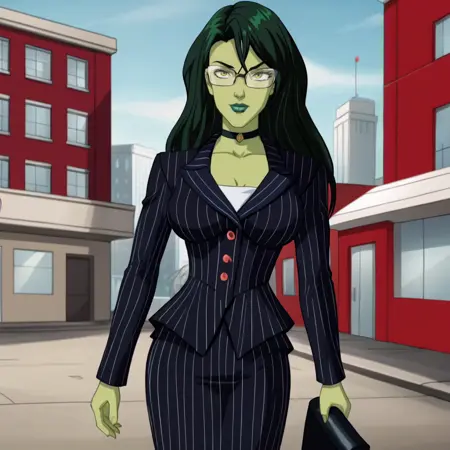 Trigger as Jennifer Walter: JenifferWalterFantasticFour, 1girl, black hair, pencil skirt, formal, skirt suit, glasses, makeup, lipstick, large breasts, pantyhose, mature female, short hair, cowboy shot